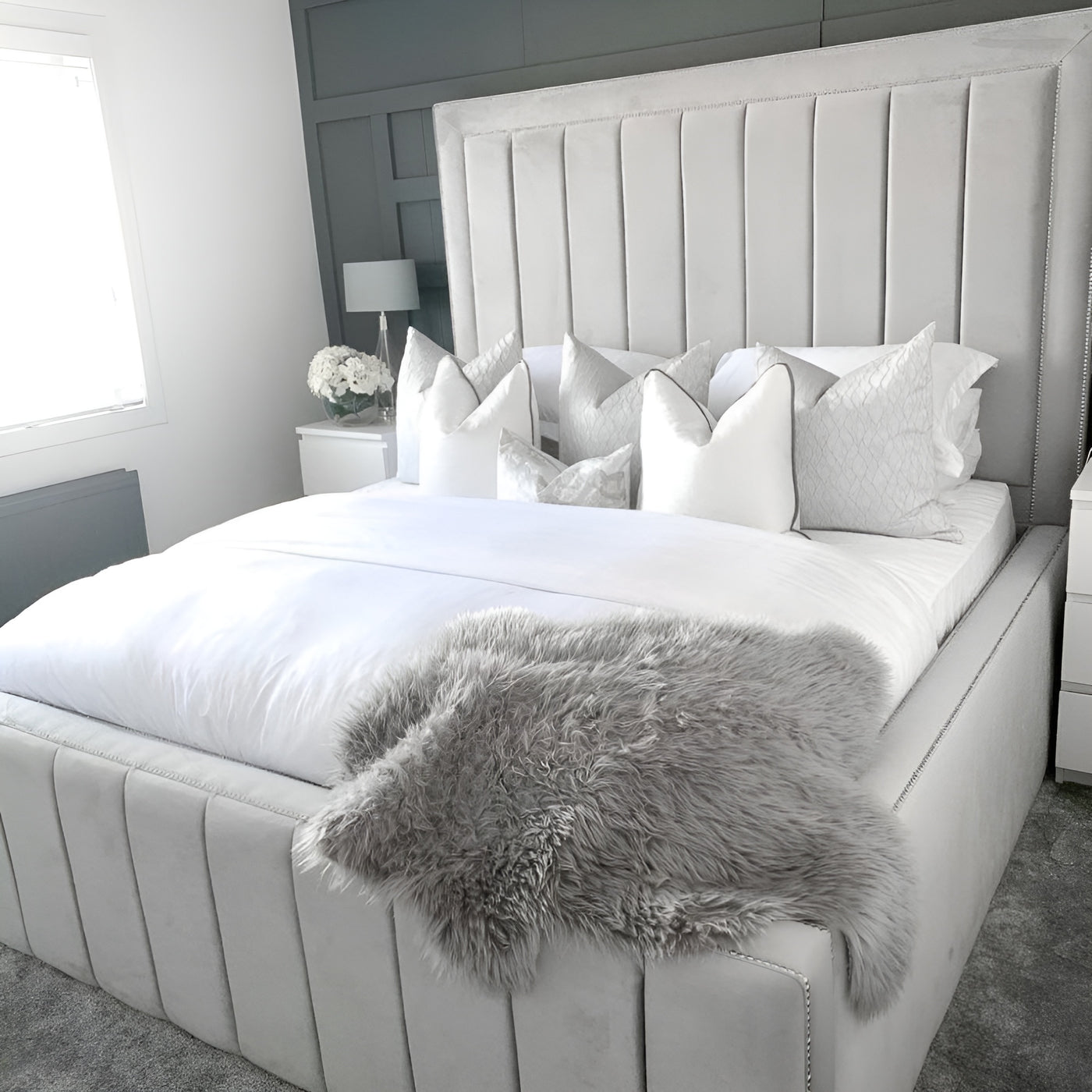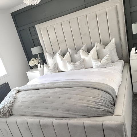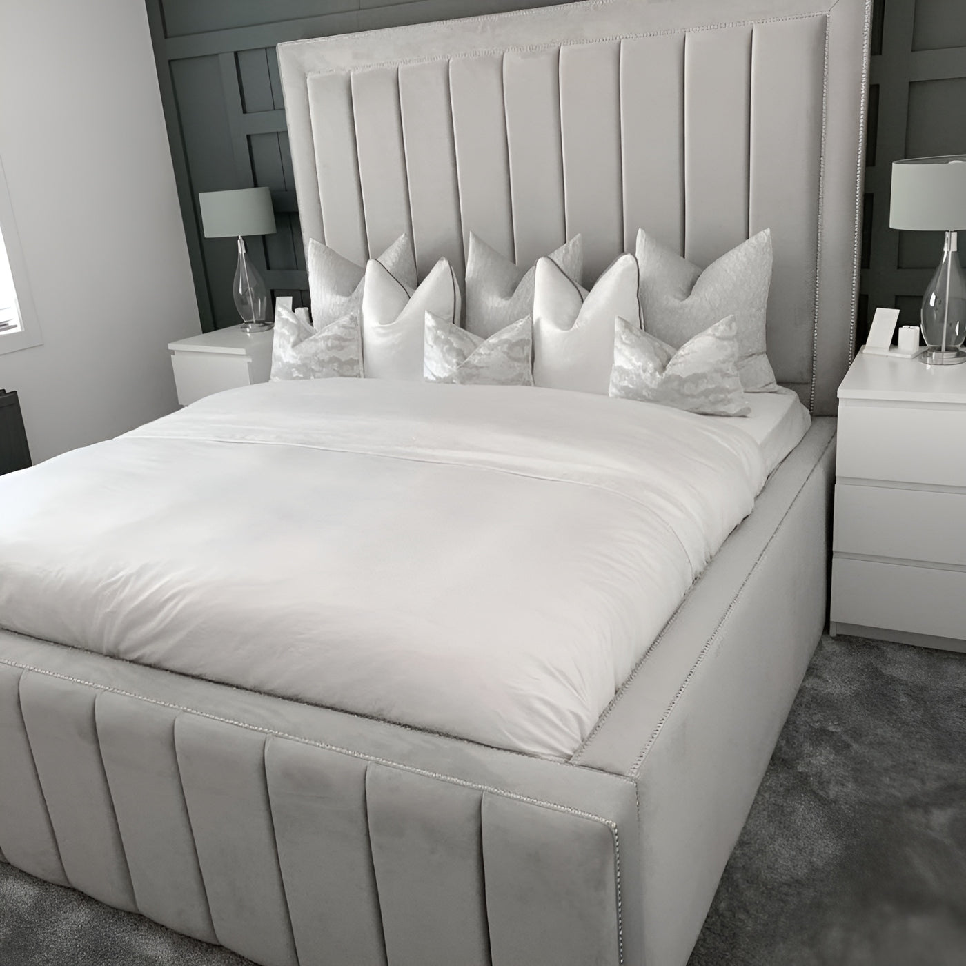 Accented by a panelled headboard with a bordered edge, this Maisonette Bed is a statement design upholstered in velvety fabric with a choice of any colour that you decide.