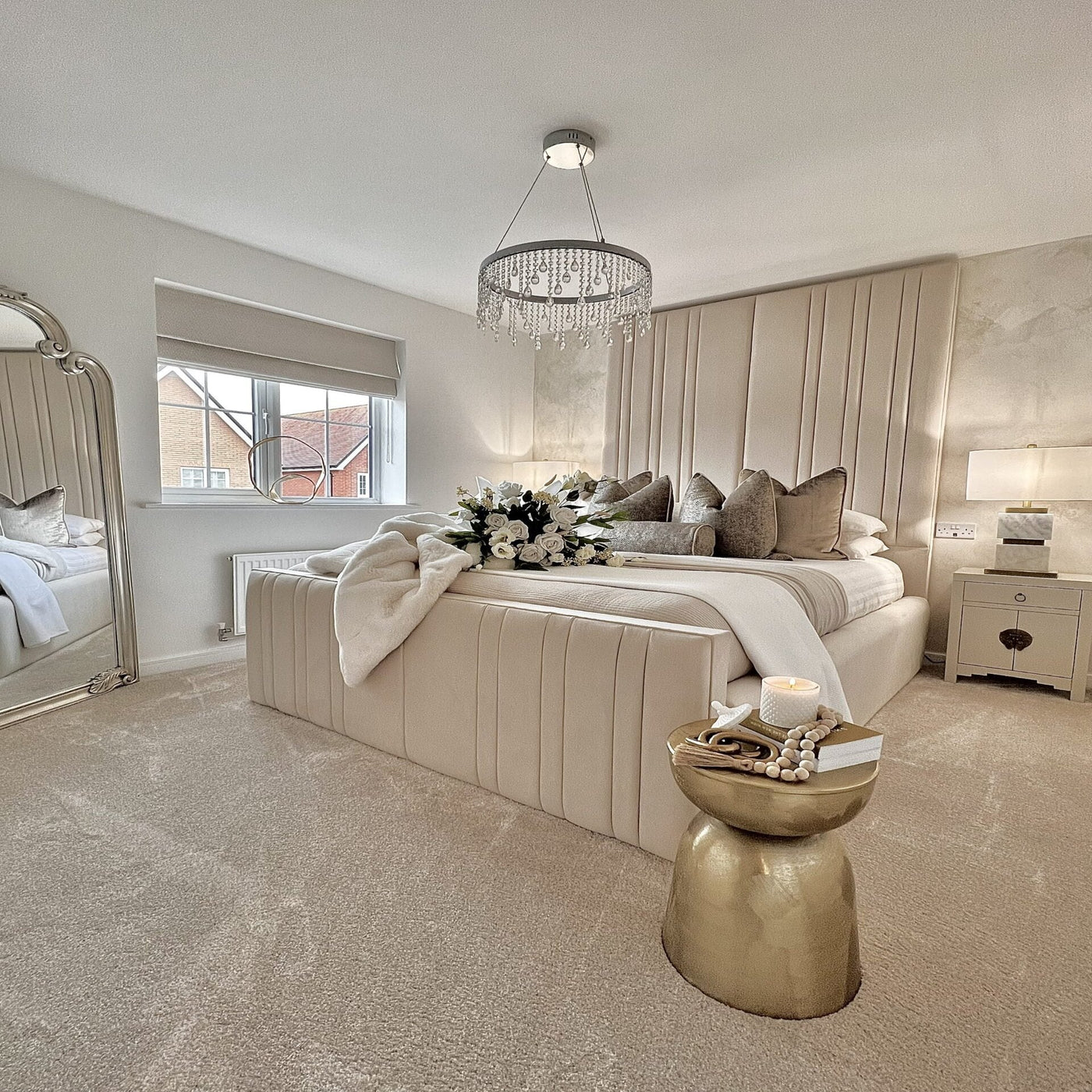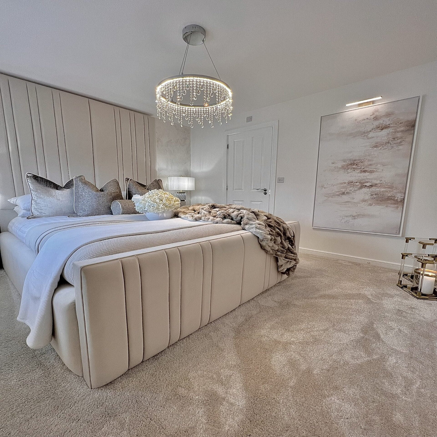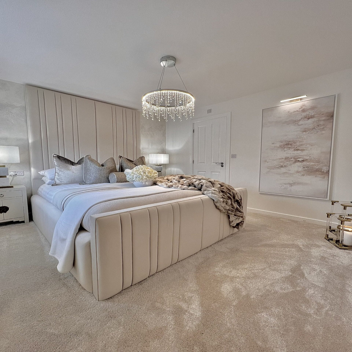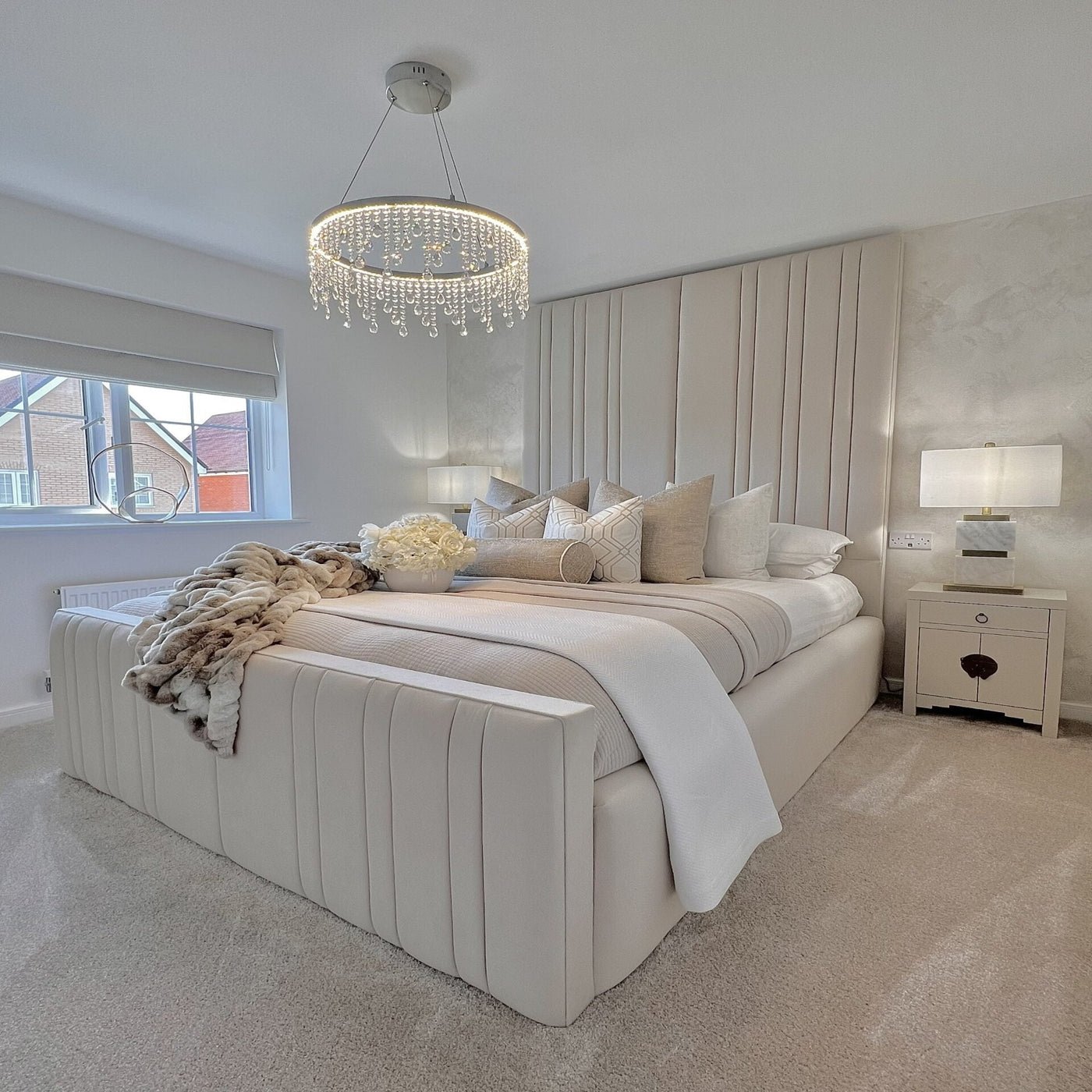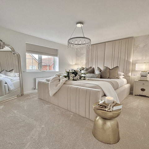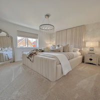 The Royale Victoria Bed is a standout piece in any bedroom it resides. The headboard's vertical design is minimal yet luxurious touch. The side rails are raised to aligns perfectly with the footend, padded and upholstered in matching fabric.