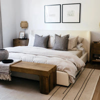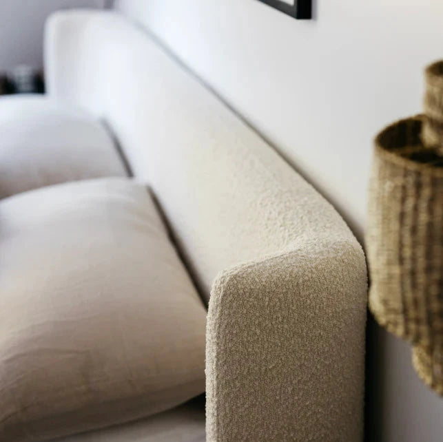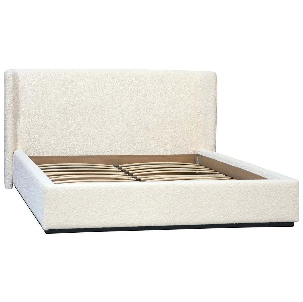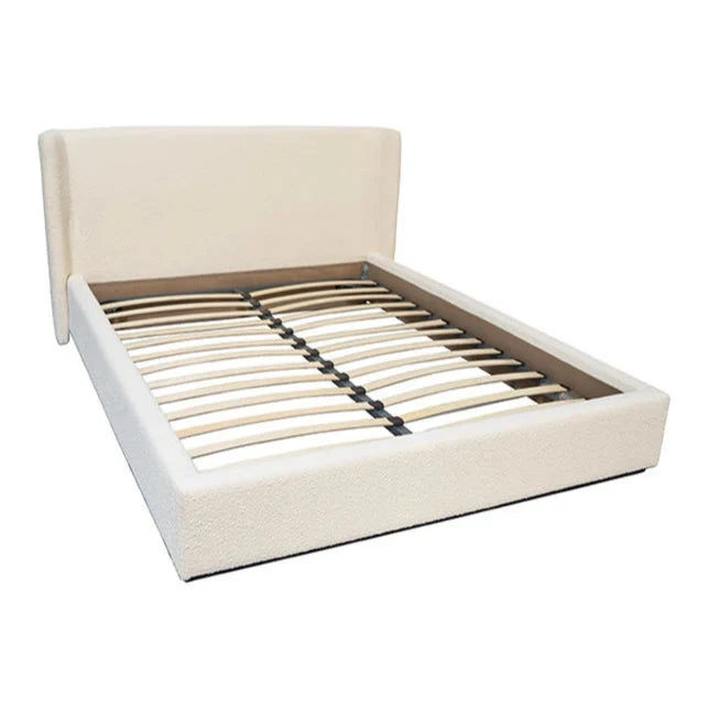 The Winged Dara Bed is a standout piece in any bedroom it resides. The headboard's curved winged design is minimal yet luxurious touch. The side rails are raised to aligns perfectly with the footend, padded and upholstered in matching fabric.