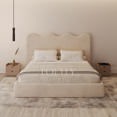 Crafted for understated elegance, the Roselyn Wave Bed is a testament to modern comfort and sleek design. Its cream-colored upholstery and softly rounded headboard bring a sense of calm sophistication to any bedroom.